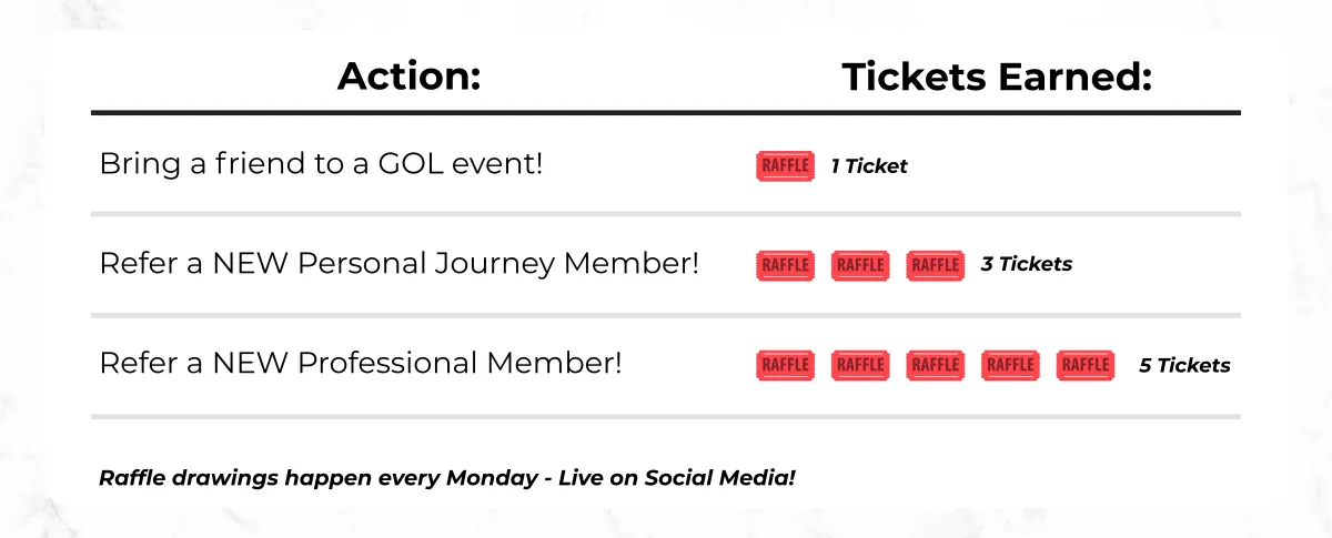 Throughout the summer, when you invite others into our vibrant GOL Network, you’ll earn raffle entries for weekly prize drawings. Whether you're bringing a friend to an event, sharing the power of our memberships, or simply spreading the word, you're helping to expand a mission rooted in holistic healing and conscious connection.